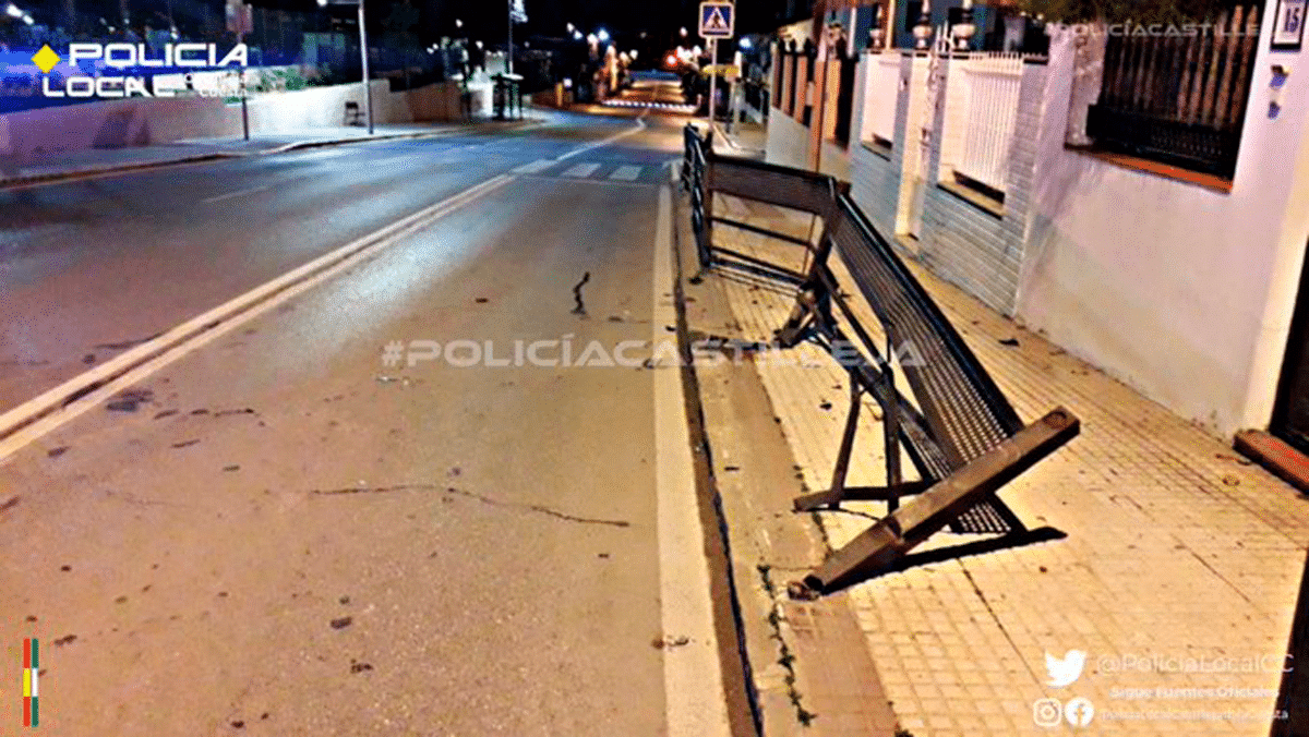 Los agentes de Castilleja de la Cuesta se encuentran investigando las causas que rodean al siniestro, que como se puede apreciar en una foto que ha subido la Policía Local a sus redes sociales, ha dejado una barandilla del pueblo completamente destrozada.
