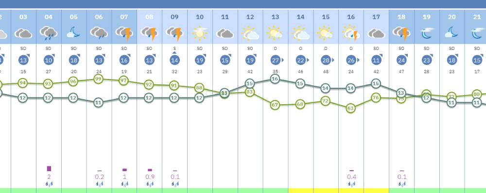 Según la previsión de la Agencia Estatal de Meteorología (Aemet), el cielo permanecerá nuboso con lluvias entre las 00:00 y las 6:00 horas, con un 100% de probabilidad y viento del suroeste de hasta 15 km/h. A las 4:00 horas se espera lluvia de mayor intensidad. La situación empeorará a partir de las 6:00 y hasta las 12:00, con tormentas y precipitaciones generalizadas, acompañadas de viento del oeste que podrá alcanzar los 25 km/h.