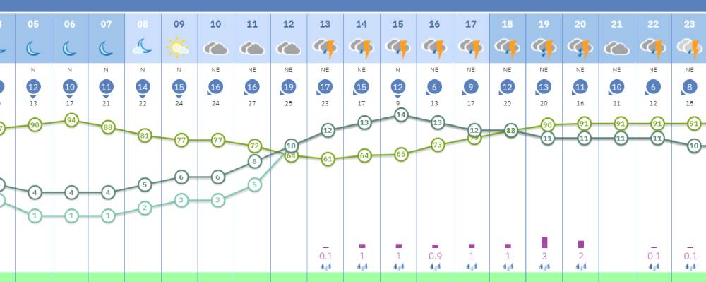 El primer episodio de precipitaciones comenzará a partir de las 13:00 horas, cuando se prevé lluvia acompañada de tormenta sobre la comarca. Este episodio se prolongará de manera prácticamente continuada hasta las 20:00 horas, concentrándose el tramo más adverso entre las 17:00 y las 20:00 horas. Dentro de esa franja, el pico máximo de intensidad se registrará en torno a las 19:00 horas, cuando los chubascos podrían ser especialmente intensos.