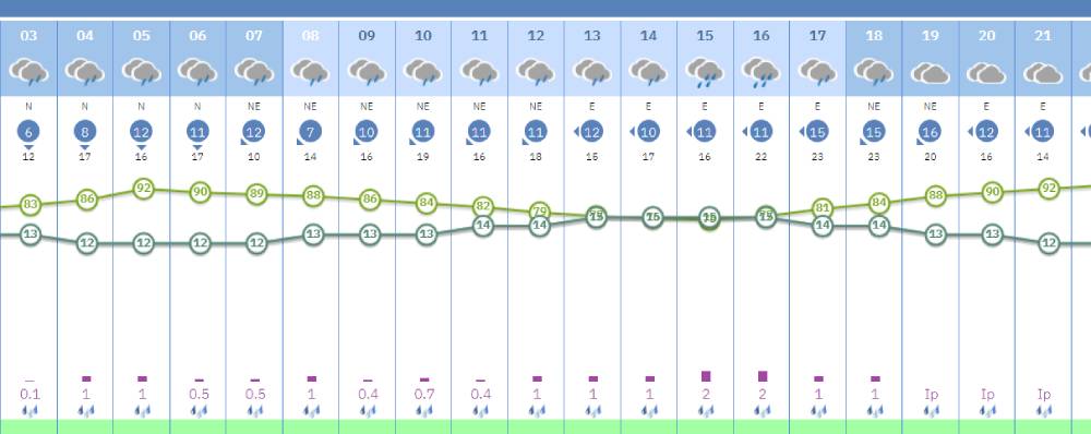 Las temperaturas se mantendrán estables, con mínimas de 10 grados y máximas cercanas a los 16. La sensación térmica será más fresca debido a la alta humedad, que alcanzará picos del 92% a las 5:00 y a las 21:00 horas, coincidiendo con periodos donde hay una mayor precipitación.