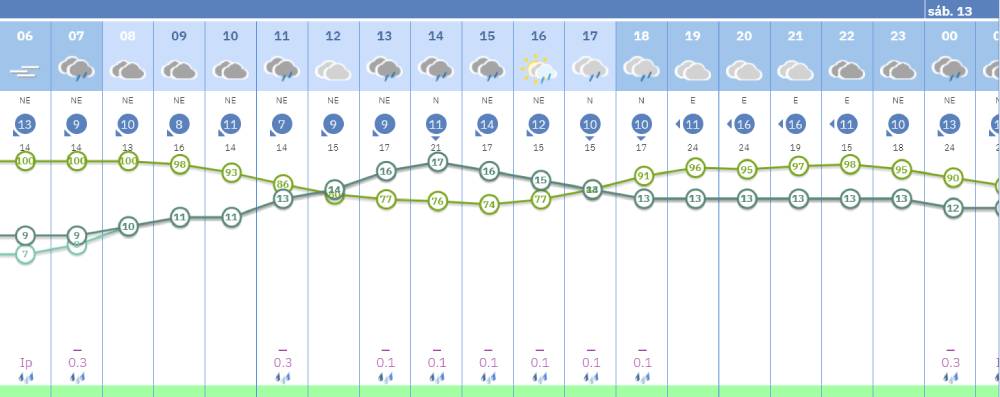 El primer episodio de precipitaciones se espera entre las 6:00 y las 7:00 de la mañana. Más tarde, los chubascos volverán alrededor de las 11:00. Durante esas horas, las condiciones meteorológicas podrían afectar al tráfico y a los desplazamientos habituales de primera hora. Tras un breve respiro, la lluvia regresará en horario de tarde, concretamente entre las 13:00 y las 18:00, coincidiendo con franjas de alta actividad urbana y comercial.