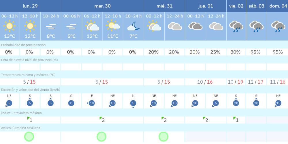 El Aljarafe ya tiene fecha marcada en el calendario para la primera lluvia destacada de 2026. De acuerdo con la previsión de la Agencia Estatal de Meteorología (Aemet), el cambio de tiempo será evidente a partir del viernes 2 de enero, con un episodio continuado de precipitaciones que se extenderá durante todo el primer fin de semana del año.