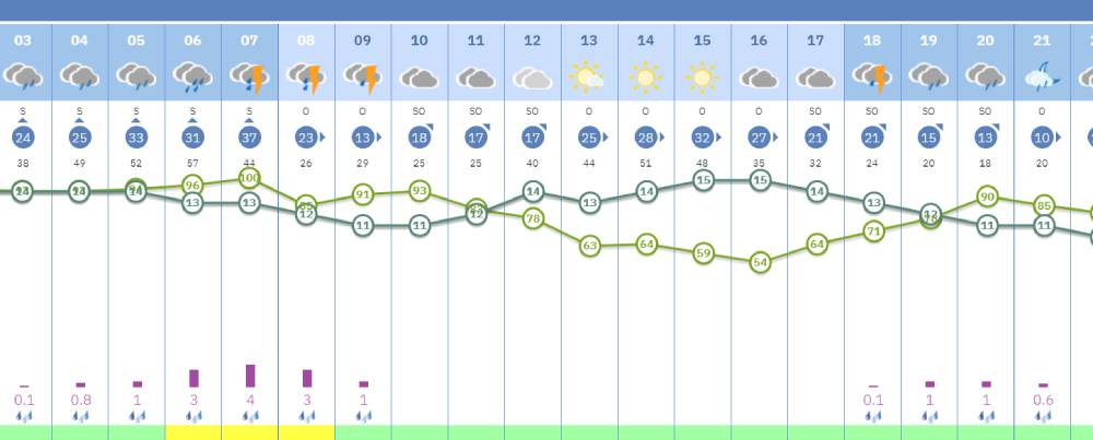 En las horas centrales del día, entre las 12:00 y las 18:00 horas, continuará la inestabilidad, con lluvias acompañadas de tormenta. Ya por la tarde, se abrirá una nueva ventana de chubascos entre las 18:00 y las 21:00 horas, con tormenta a primera hora de la tarde.