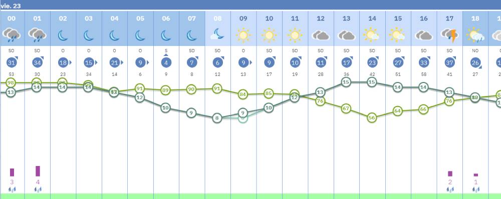 Las precipitaciones, que comenzaron en la tarde del jueves 22, se prolongarán durante la madrugada del viernes. Hasta pasada la medianoche continuará lloviendo, con precipitaciones hasta la 1:00 horas y rachas de viento del suroeste que podrán alcanzar los 37 kilómetros por hora. Entre las 00:00 y la 1:00 de la madrugada, la lluvia será especialmente intensa. En el tramo comprendido entre las 00:00 y las 6:00 horas, el cielo se mantendrá nuboso con lluvias débiles y una probabilidad de precipitaciones del 60%.