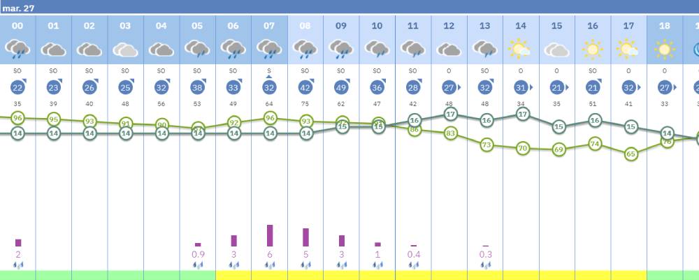 A partir de las 6:00 horas permanecerá activo el aviso amarillo por lluvias y viento, que se extenderá hasta las 17:00 horas. Durante la mañana, la probabilidad de precipitaciones será del 100%, con cielos cubiertos hasta el mediodía, a partir de las 12:00 horas, descenderá hasta el 45%. A las 13:00 horas seguirá lloviendo, aunque con menor intensidad.