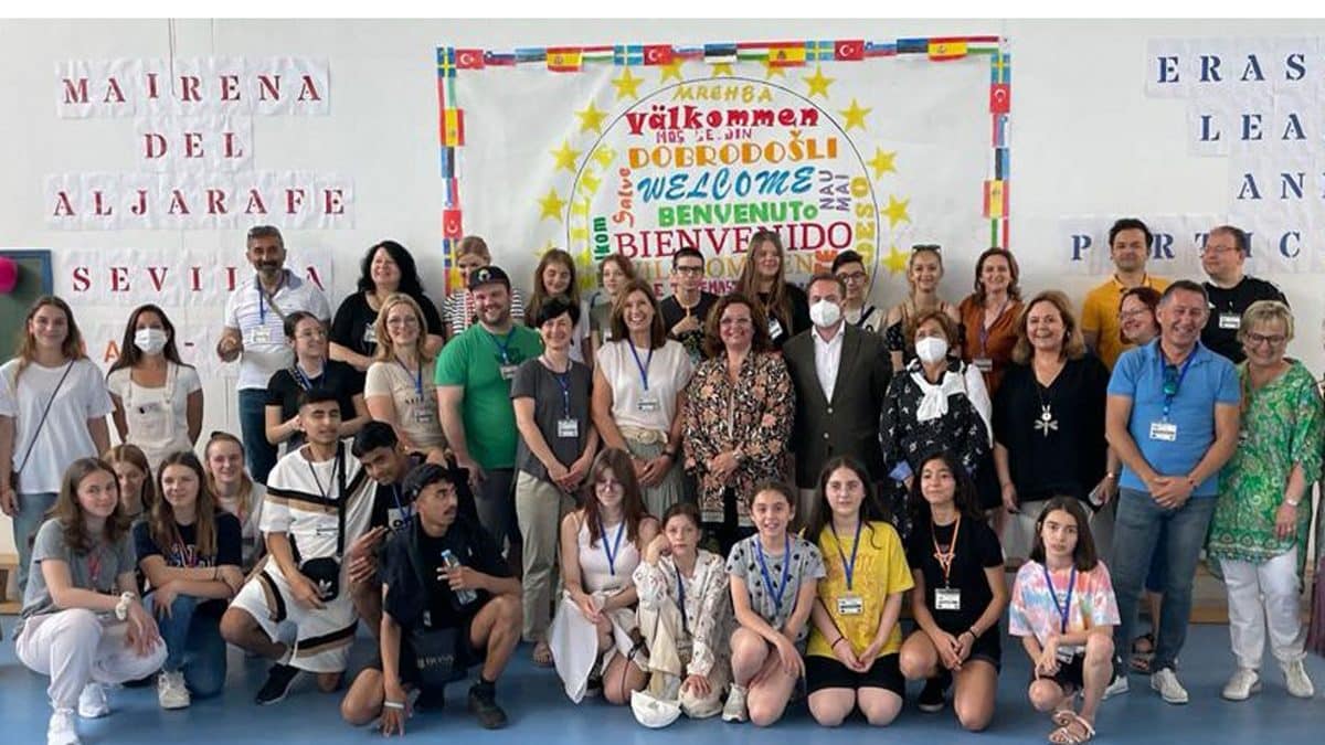 La delegada de Educaciรณn y Deporte de la Junta en Sevilla, Marรญa Josรฉ Eslava, acompaรฑada del alcalde de Mairena del Aljarafe, Antonio Conde y la directora del centro, Maribel Vera, ha participado en el acto de bienvenida, en el CEIP Santa Teresa de Mairena del Aljarafe, de las delegaciones de los cinco paรญses participantes en dicho programa europeo.