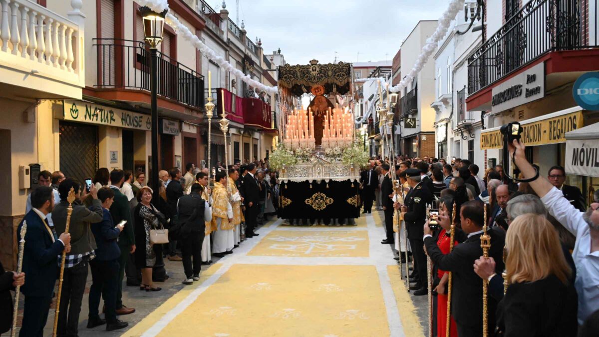 La Virgen, que portó el bastón de mando otorgado por el Ayuntamiento como símbolo de su unión con el municipio, recorrió las calles engalanadas de Tomares entre vítores, cánticos y lluvias de pétalos. Miles de tomareños la acompañaron en un cortejo presidido por el alcalde José María Soriano, el Hermano Mayor de la Hermandad Sacramental, Joaquín Manzano, el párroco Fernando Emilio Borrego Ojeda, y otras autoridades civiles y religiosas. «He tenido el inmenso honor de acompañar a Ntra. Sra. de los Dolores en su procesión extraordinaria como Patrona Canónica y Alcaldesa Perpetua de Tomares. Un día histórico e inolvidable que quedará para siempre en el corazón de nuestro municipio», destacó el regidor.